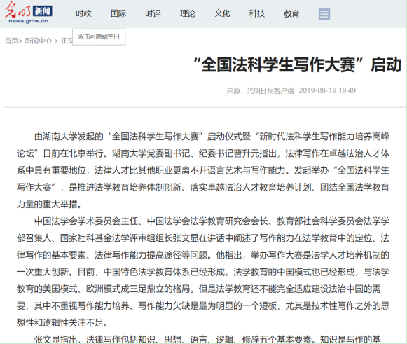 “全国法科学生写作大赛”的成功启动引发全国媒体密集报道。截止到8月底,据不完全统计,已有《光明日报》、《中国法学》杂志社、人民网、中国网、《检察日报》、《法治周末》、法制网、中国教育新闻网、《潇湘晨报》、澎湃新闻网、腾讯网、网易、今日头条、法律博客、科教文汇、北国网、天天快报、网易快报、天下看点、中国教育人才网、红网、新浪湖南、深圳热线、东方资讯、110法律咨询网、搜狐、华奇网、求学网、凯迪网络等全国三十多家媒体的报道,此外还有郑州大学 海角社区
