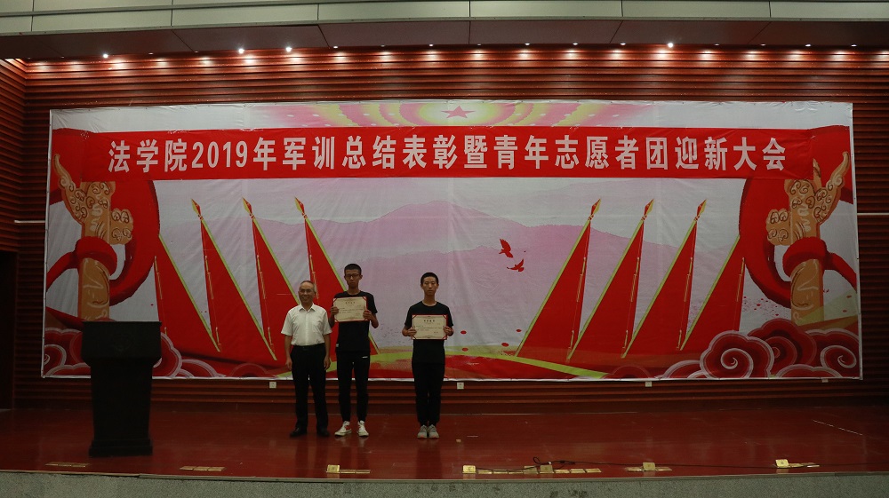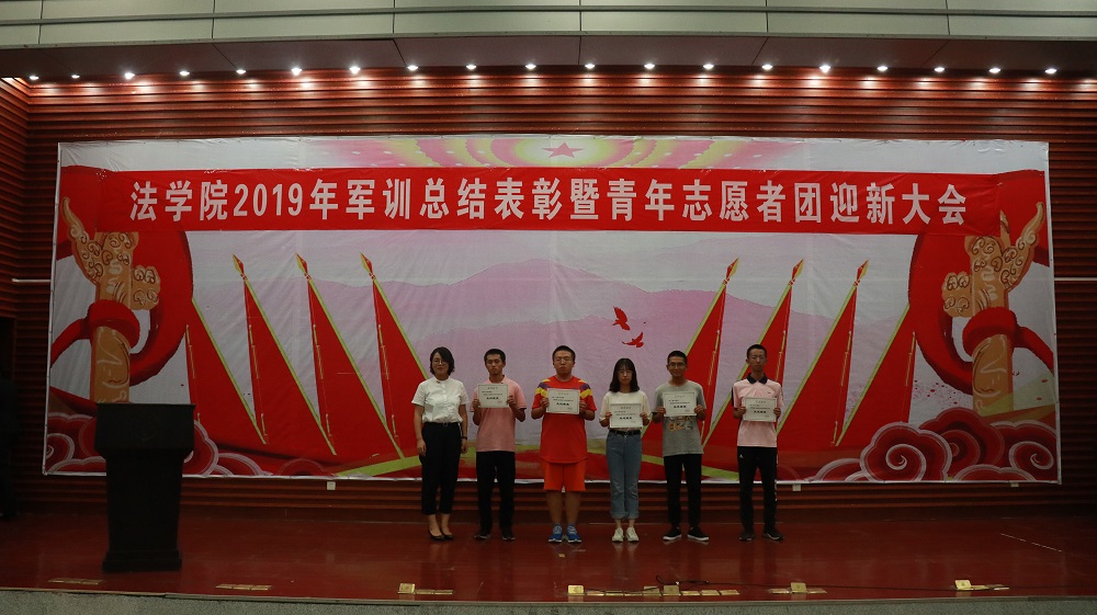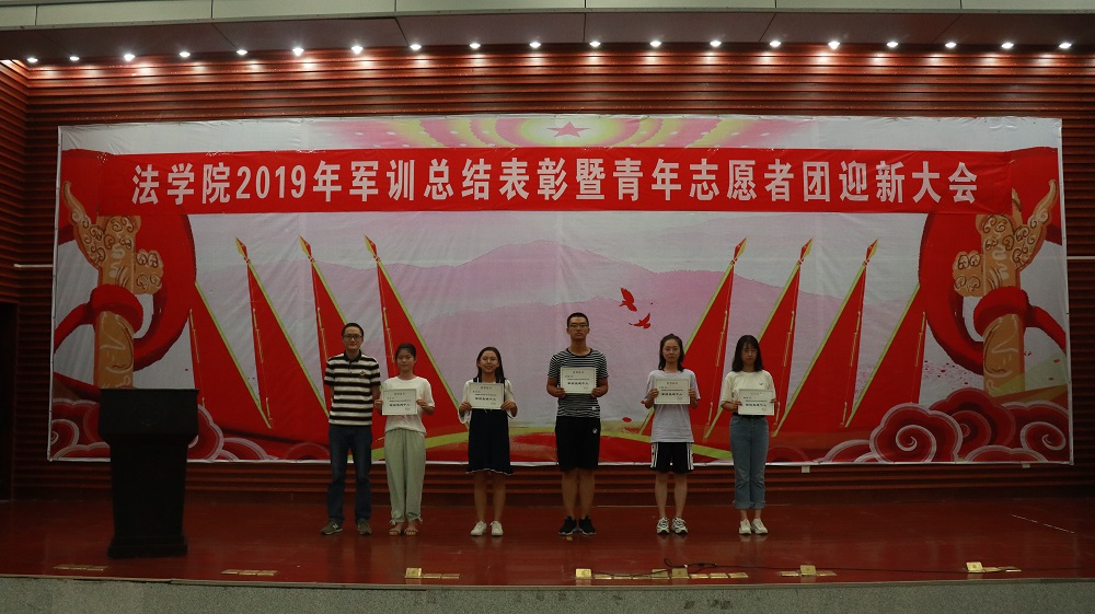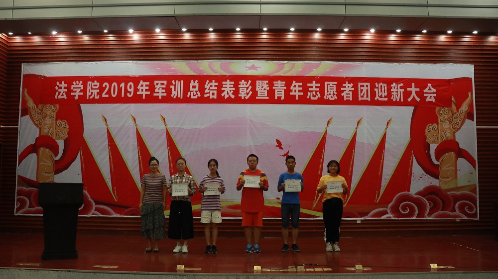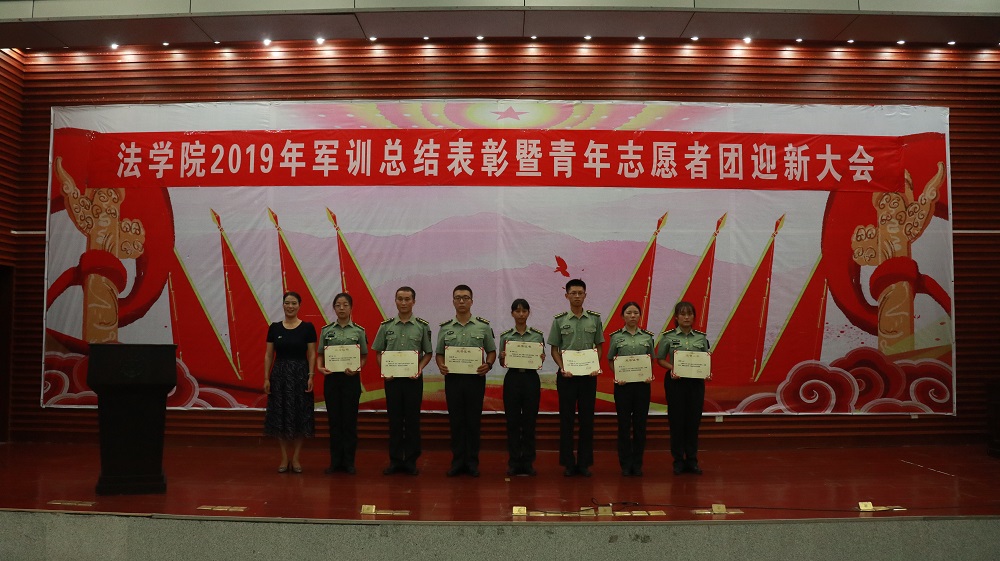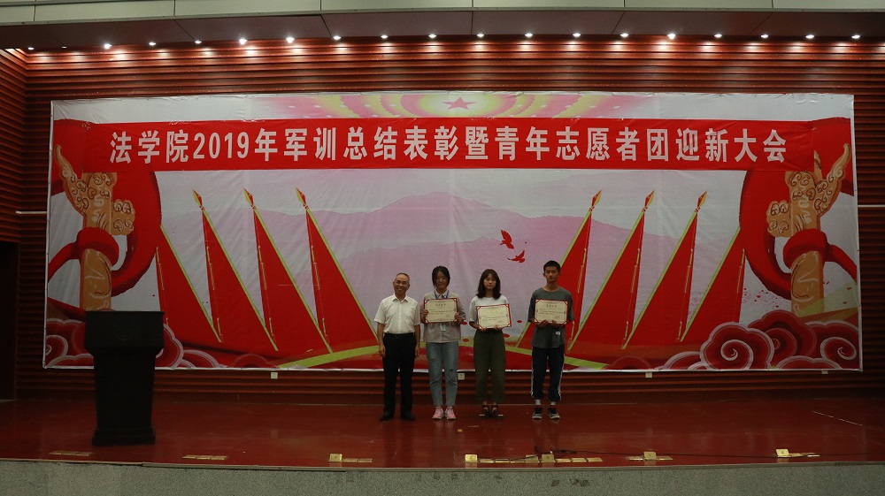 经屈院长宣读表彰决定,学院授予2019级法学三班、法学四班军训队列优胜班级荣誉称号,授予2019级法学一班、法学二班、法学五班军训作风纪律先进班级荣誉称号,授予天马园区三区九栋433寝室等十个寝室军训内务评比优胜寝室荣誉称号,授予许昕、张思等十五人为军训先进个人,同时嘉奖全程参与2019级新生军训工作的迎新团队成员和全体三营教官。