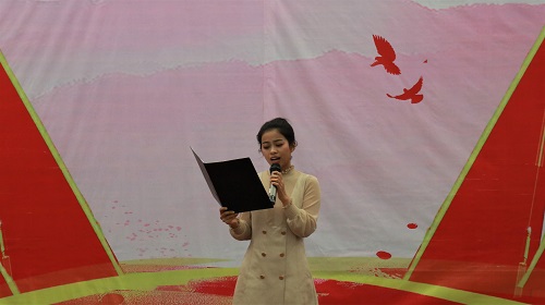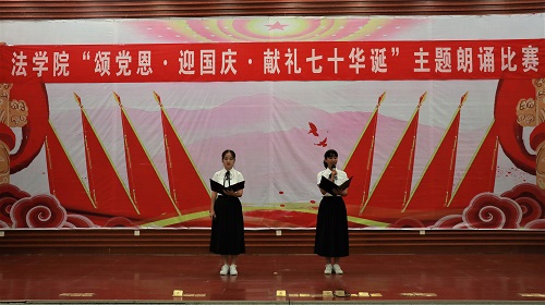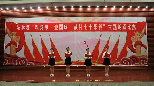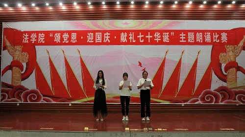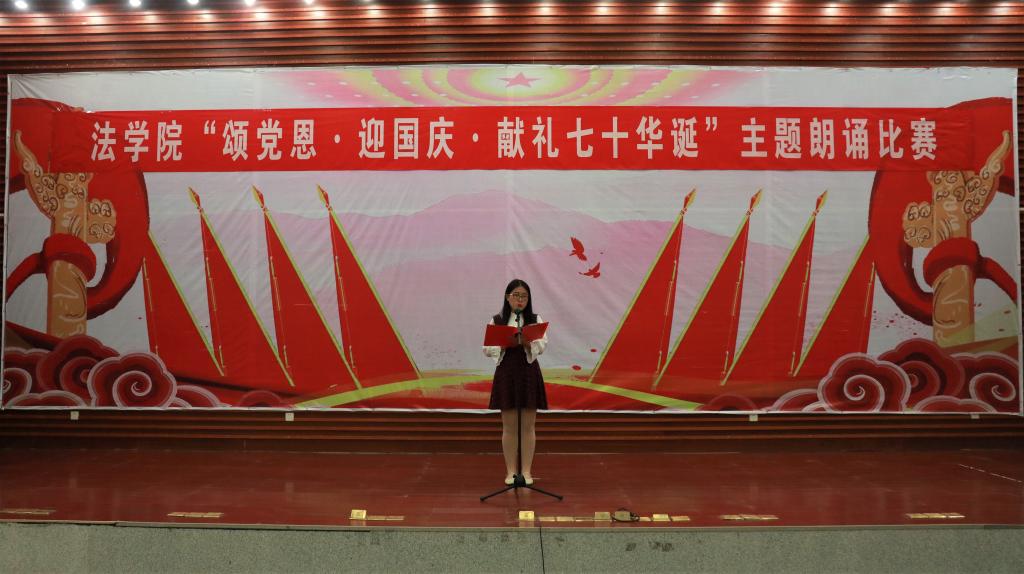 比赛中,17、18、19级学子各展风采,追忆祖国苦难的过去,歌颂祖国光辉的成就,展望祖国光明的未来。1705班谷雨等同学朗诵《我的祖国》气势雄浑;1802班赵雅诗等同学朗诵《我的祖国》展现巾帼不让须眉的豪情。在或沉郁或高亢的背景音乐中,参赛选手们深情朗诵,向祖国母亲告白。由1803班夏明雪等同学带来的诗朗诵《青春中国》以新颖的形式和饱满的感情获得在场师生的一致好评;1901班邹禹等同学共吟《中华颂》,默契的配合赢得阵阵掌声。