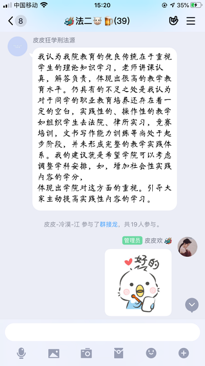 法学1801班于5月10日晚举行了线上班会,同学们积极参与,建言献策。在此次讨论活动中,同学们不仅对学校、学院的人才培养工作进行了回顾与评价,还对下一步“落实人才培养中心地位”的工作提出了建议,以下是同学们关于三大问题的讨论成果的整理汇总: