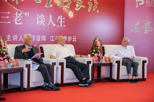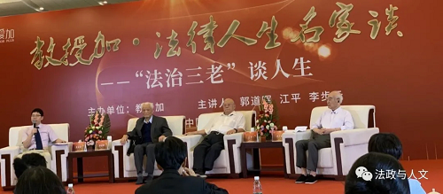 蒋海松副教授在开场白中说,三老都是德高望重,年高德劭,平均年龄应该是90高龄了。法学界拥有三老,则是法界盛事,国之至宝。人们尊称法治三老,不仅仅是因为他们高寿年长,更是因为他们敢于担当,敢于发声,在历史的重要关口总是发出法学界的最强音,影响了一代又一代法律人。郭老因此被誉为“时代的良知”,法律思想家,江老是“中国法学的良心”,“一生只为真理低头”,李老被誉为“敢开法治第一腔”,是人权法的旗手。