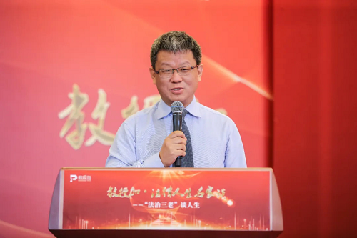 李步云先生回顾了自己从革命到学者的生平,勉励年轻人投身法治实践。在得知很多学生即使疫情管控也迫切希望亲自来到活动现场时,高度赞扬了当代法学生的好学精神,称法学生为“五六点钟的太阳”,并鼓励年轻一代刻苦钻研、“世界终究是你们的。”