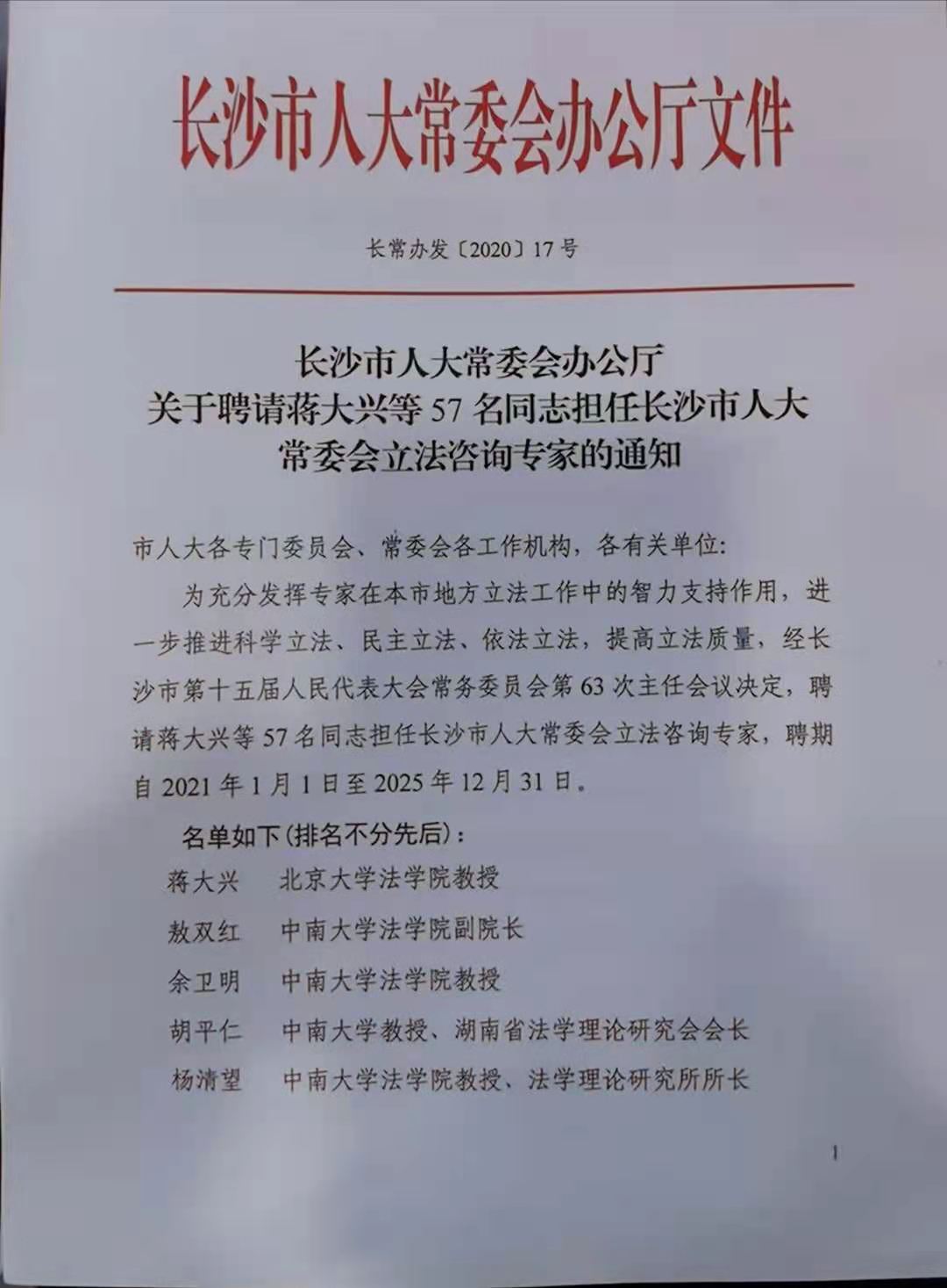 2020年12月21日下午,长沙市人大常委会举行立法咨询专家聘任会,正式聘请57位同志作为市人大常委会新一届立法咨询专家。 海角社区 教师高中、郭哲、唐双娥当选。市人大常委会主任谢卫东为专家颁发聘书并讲话,市人大常委会副主任王国海主持聘任会,市人大常委会秘书长柳美景出席。依托立法咨询工作,专家们可充分发挥专业优势和学术特长,为地方立法提供专业支撑和智力支持。