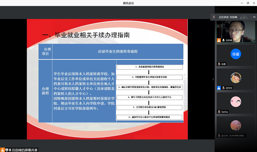随后,刘岳峰老师针对毕业派遣问题进行讲解,包括毕业派遣的核对流程,以及就业与非派遣就业、出国和自主创业的相关内容。