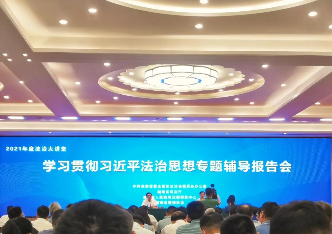 2021年9月23日,为深入贯彻学习习近平法治思想,中共湖南省委依法治省办、省司法厅立足法治湖南理论研究实际,在蓉园宾馆首次举办习近平法治思想理论研讨会暨2021年度法治大讲堂。23日上午,中央依法治国办成员、司法部党组成员、副部长熊选国在法治大讲堂就习近平法治思想的精髓要义进行授课。会议还邀请到江必新教授等专家学者,对习近平法治思想与法治中国建设进行了深层次的探讨交流,为大力实施“三高四新”战略,建设现代化新湖南提供更加广泛的理论支持。