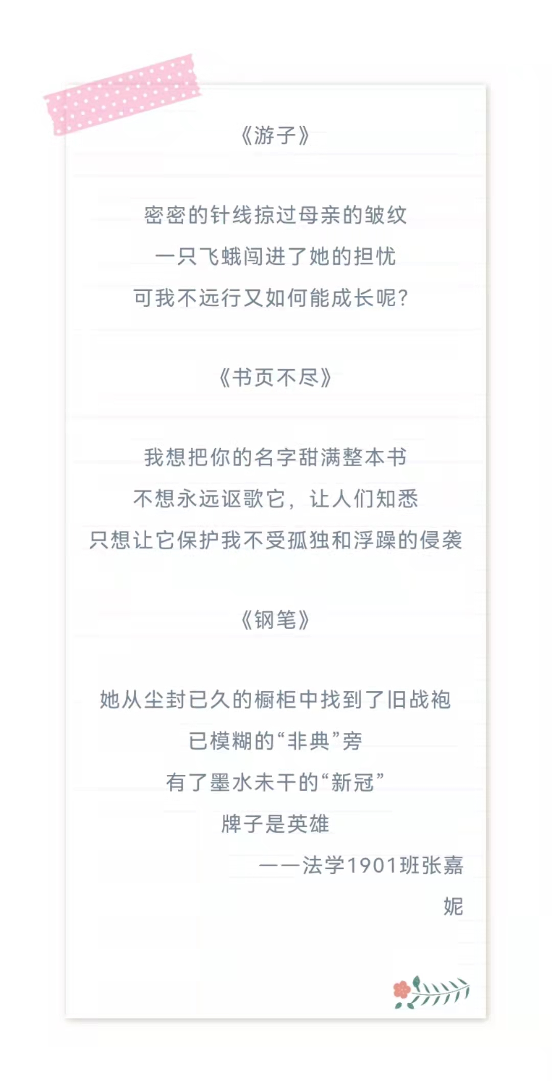 水池里的金鱼、和宿舍楼下的胖橘道一声再见。天高任鸟飞,我们在过去的四年已将知识打包成奔赴法律道路上的行囊,现在正整装待发追逐那属于我们的远大前程。多年以后再相聚时,再微笑着跟那些熟悉的面孔道一句好久不见。