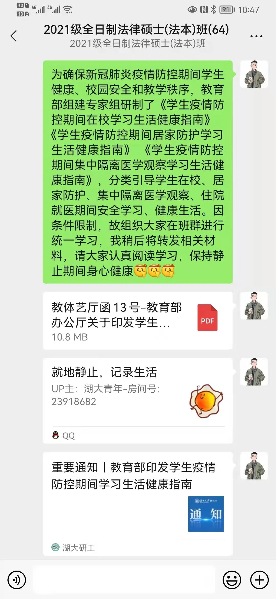 以党支部各班级和研究生会各部门为单位,组织同学们认真学习专家组研制的《学生疫情防控期间在校学习生活健康指南》《学生疫情防控期间居家防护学习生活健康指南》 《学生疫情防控期间集中隔离医学观察学习生活健康指南》,分类引导学生在校、居家防护、集中隔离医学观察、住院就医期间安全学习、健康生活。