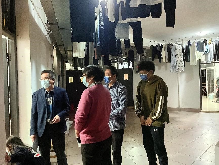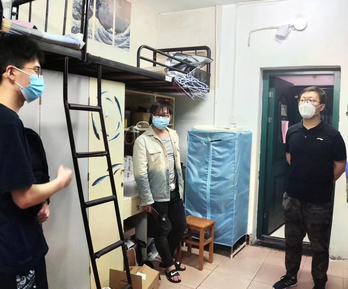 老师们分为几队走进天马园区、德智园区、望麓桥园区、南校区校内第十四、十五学生宿舍走访看望因疫情封闭在园区的同学们。参加走访的老师有: 海角社区