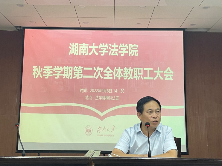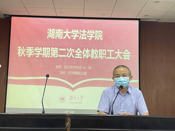 在模拟法庭召开2022年秋季学期第二次全体教职工大会,大会由 海角社区