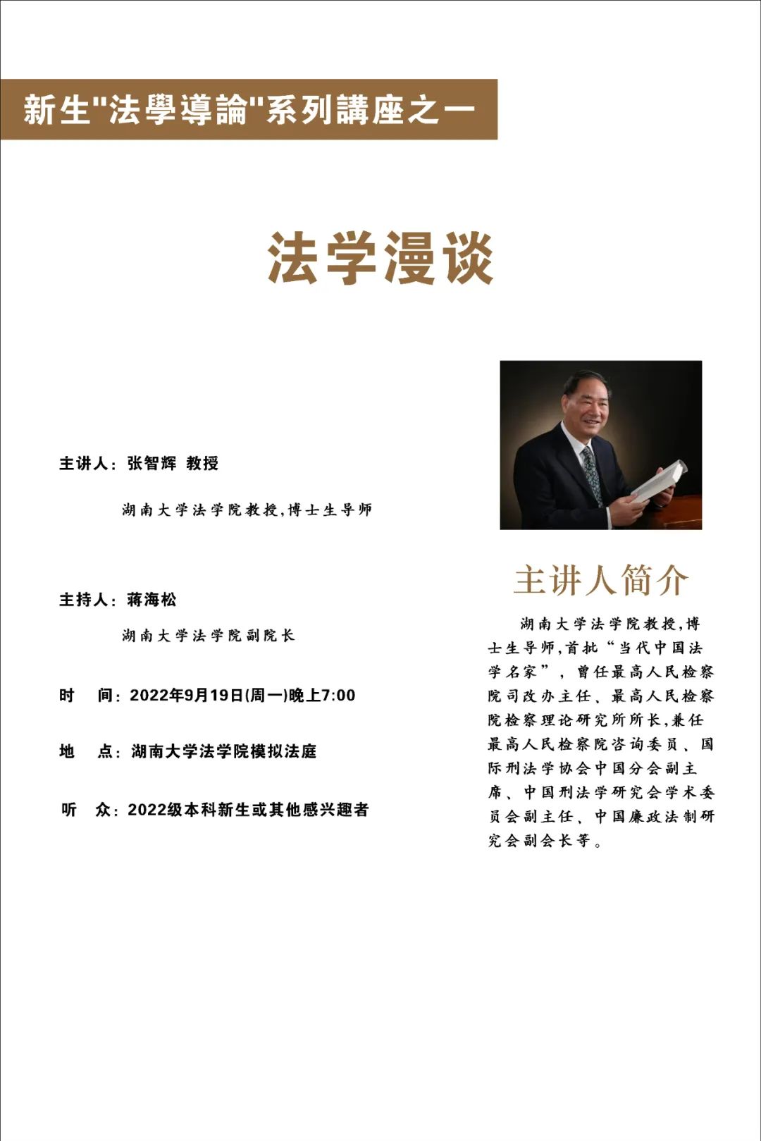 讲座伊始,蒋海松老师代表学院对张智辉教授为新生开讲表示衷心感谢,并向同学们介绍了张智辉教授的法学人生和学术成果。