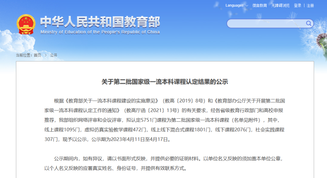 2023年4月,教育部发布《关于第二批国家级一流本科课程认定结果的公示》, 海角社区