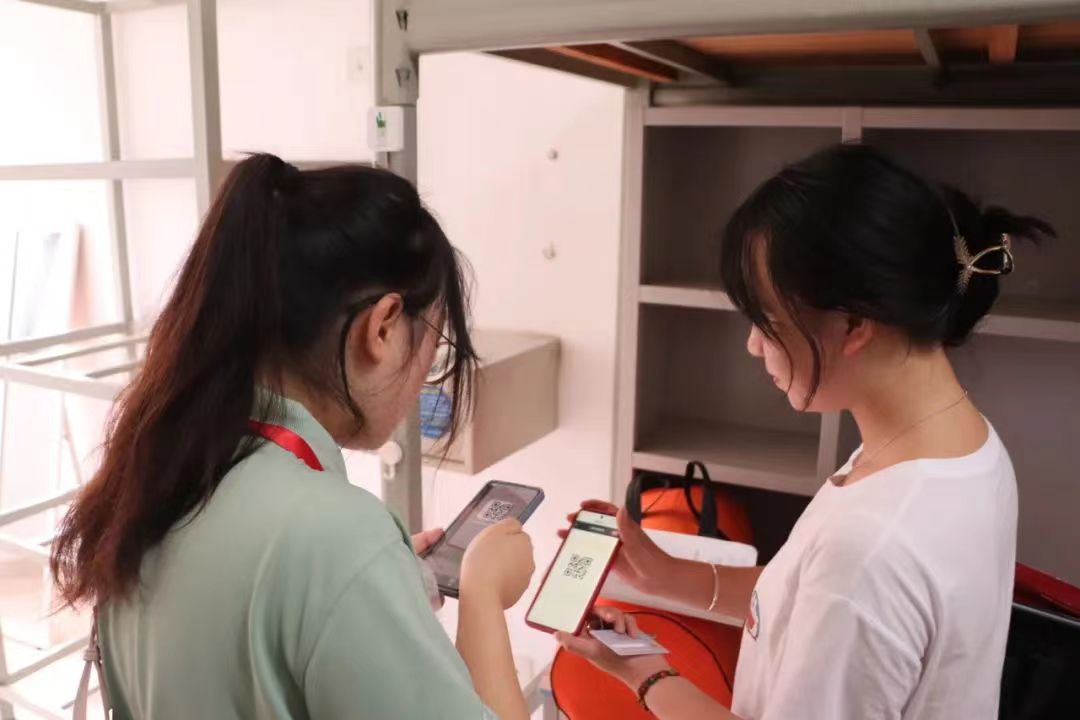 迎新团队为新同学扫描报到码,核对信息并叮嘱注意事项。