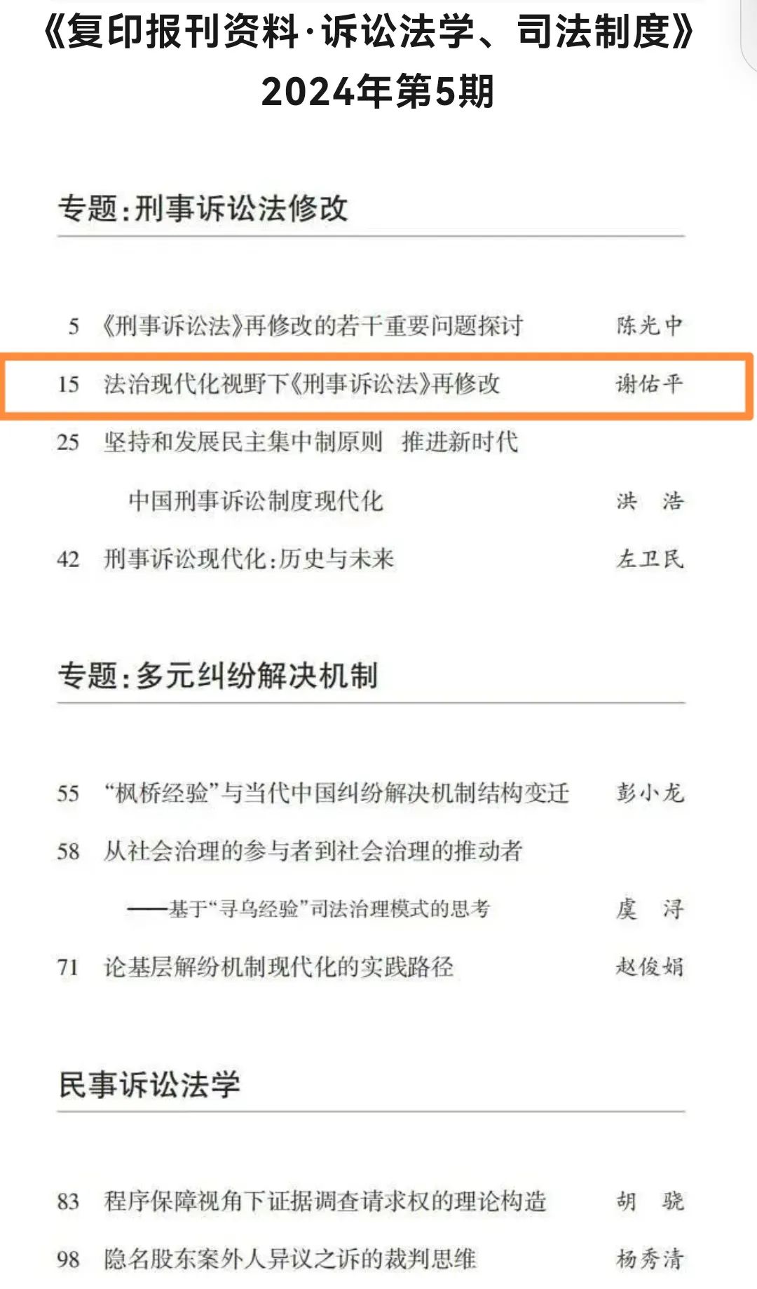 谢佑平教授的论文《法治现代化视野下〈刑事诉讼法〉再修改》被人大复印报刊资料《诉讼法学、司法制度》2024年第5期原文转载。该文原载于《政法论坛》(CLSCI来源期刊)2024年第1期。