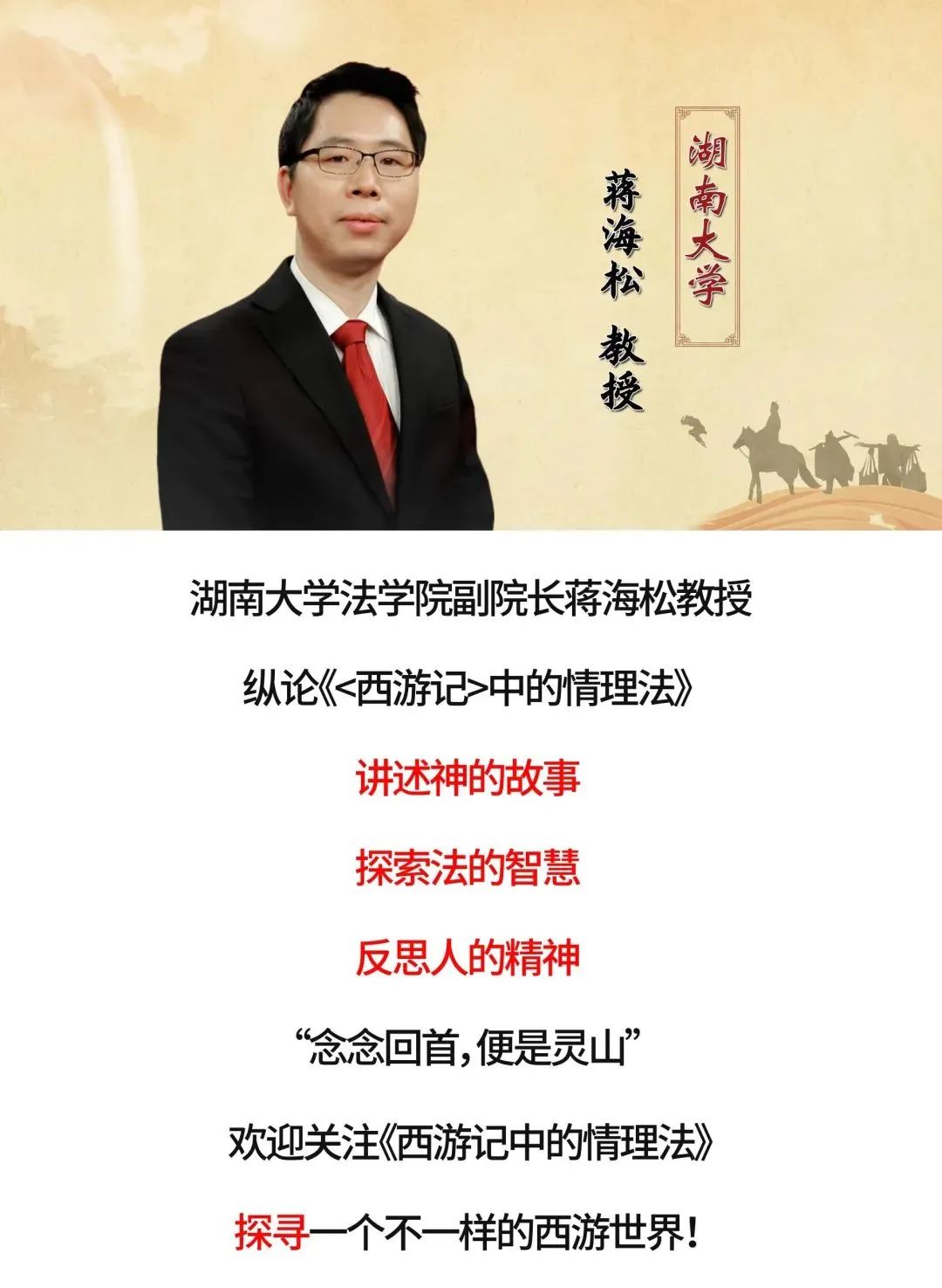 副院长蒋海松教授主讲。这是《百家讲坛》首次推出法律文化类节目,通过经典文学名著《西游记》解读明代社会的情理法之辩,探讨古代律法的治理智慧。