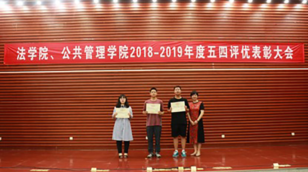 委员会上台宣读大会表彰决定。随后,学生会主席张子政宣读获奖名单,颁发“五四红旗团支部”、“最佳主题团日活动”等集体奖项后,2017 级法学五班团支部、2018 级行政管理二班团支部分别作为代表,做五四红旗团支部、最佳主题团日活动风采展示。随后,颁奖环节继续进行,出席会议的领导老师依次为获得“三好学生标兵”、“三好学生”、“优秀团员”、“优秀团干部”、“优秀学生干部”、“学习进步奖”、“优秀学生”、“优秀志愿者”、“优秀干事”、“体育贡献奖”、“优秀寝室”、“2018年暑期‘三下乡’活动先进个人”、“2018年暑期‘三下乡’活动先进团队”等各类奖项的获奖同学颁发了荣誉证书,最后由李思月同学作为代表,上台展示学院在2018年暑期“三下乡”活动中取得的优异成果。