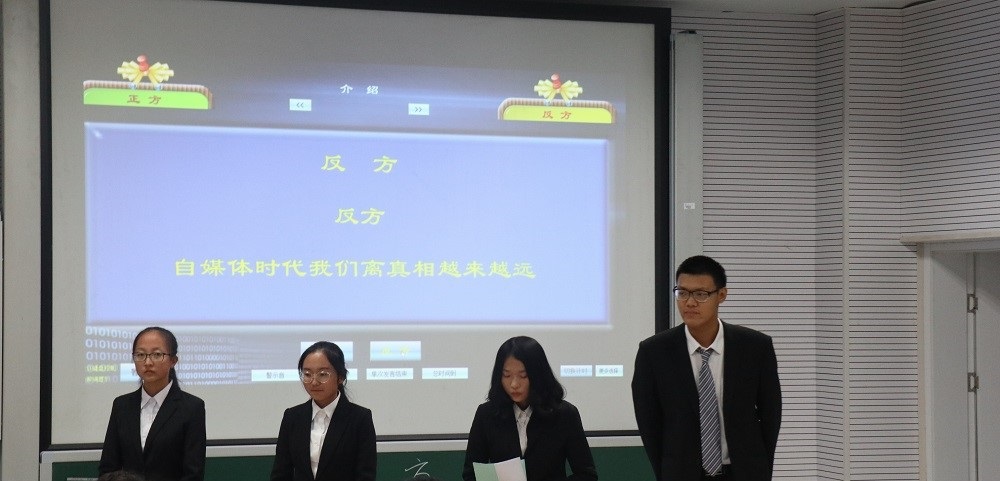 第一场为季军争夺赛,正方持“自媒体时代我们离真相越来越近”观点,反方持“自媒体时代我们离真相越来越远”观点。立论环节,正方提出此次讨论标准为民众是否对真相能有更广泛、更全面、更主动的了解,并从自媒体利于更广泛全面了解真相、自媒体为大众主动发布及接收真相提供平台、自媒体通过信息监督提高了信息准确度三方面论证自媒体时代我们离真相越来越近。而反方则通过自媒体时代下新闻产生低门槛追求爆点且假新闻泛滥、新闻传播中歪曲事实监管困难、新闻接受时信息爆炸难以甄别三个论点来论证在自媒体时代我们离真相越来越远。双方在自媒体时代下谣言是否可以得到有效的遏制上展开了积极交锋。点评环节,苑初琳对双方的比赛进行了客观评价,指出了比赛双方立论清晰、表述明白等优点,同时也指出了双方交战不够大胆、攻击力度不够等不足,并提出了许多具有建设性的建议。最后反方以较为出色的临场与团队配合取得了胜利,正方三辩龚星琦为本场“最佳辩手”。