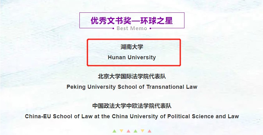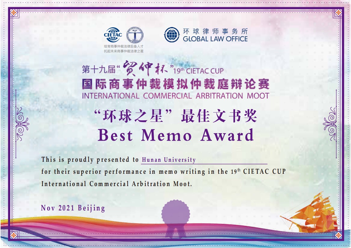 代表队以卓越的表现荣获Best Memo(最佳书状奖—环球之星,全国第一)以及庭辩Third Class Prize(三等奖)。同时,岳正圆同学荣获循环赛Best Oralist(最佳辩手);曲筝同学荣获Outstanding Contribution Award(团队突出贡献奖)。