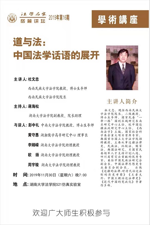 招聘教授。主要从事边疆法律史、民族法、比较法、儒家法、韩国法研究。系国家民委领军人才支持计划人选、四川省有突出贡献的优秀专家,兼任中国民族法研究会副会长,中国法律思想史专业委员会副会长。出版《边疆的法律:对清代治边法制的历史考察》《王者无外:中国王朝治边法律史》《近代中国的宪政化》等著作多部。