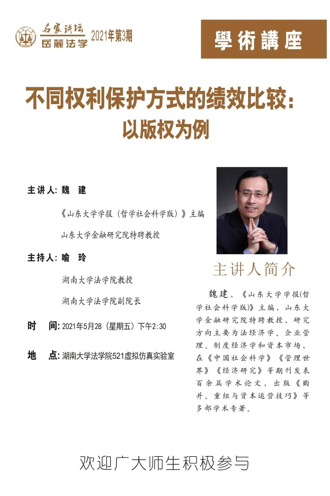 魏建,《山东大学学报(哲学社会科学版)》主编,山东大学金融研究院特聘教授,研究方向主要为法经济学、企业管理、制度经济学和资本市场,在《中国社会科学》《管理世界》《经济研究》等期刊发表百余篇学术论文,出版《购并、重组与资本运营技巧》等多部学术专著。