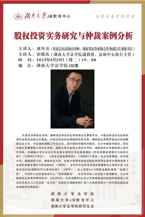 本次JM实务讲座邀请到民建会员高级经济师,湖南省证券业协会常务副会长兼秘书长——刘丹岳,为大家讲述股权投资实务研究与仲裁案例分析,帮助大家了解相关实务问题, 海角社区