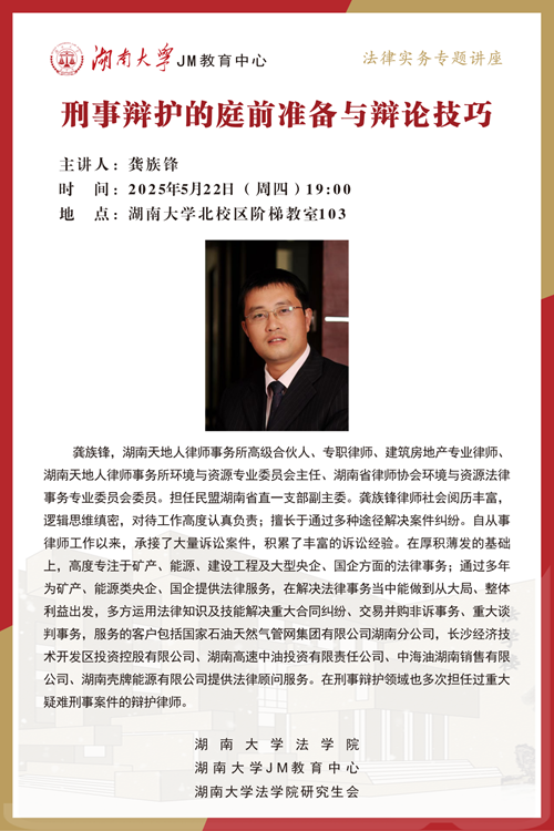 本次JM实务讲座邀请到湖南天地人律师事务所高级合伙人龚族锋律师,为大家讲述刑事辩护的庭前准备与辩论技巧,帮助大家了解相关实务问题,欢迎同学们积极参与!
