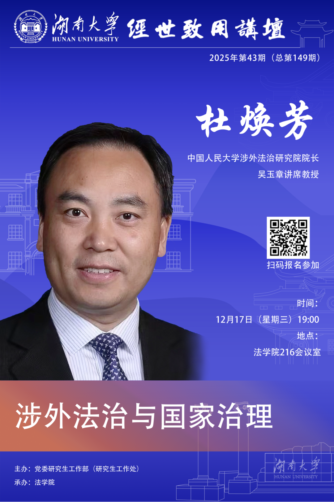 12月17日19:00邀请中国人民大学涉外法治研究院院长、吴玉章讲席教授杜焕芳于 海角社区