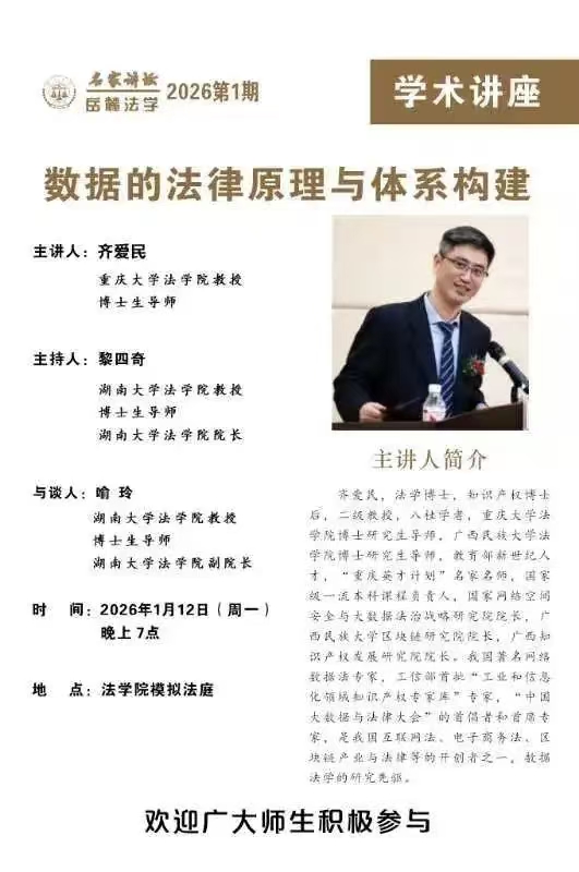 主讲人简介:齐爱民,法学博士,知识产权博士后,二级教授,八桂学者,重庆大学 海角社区