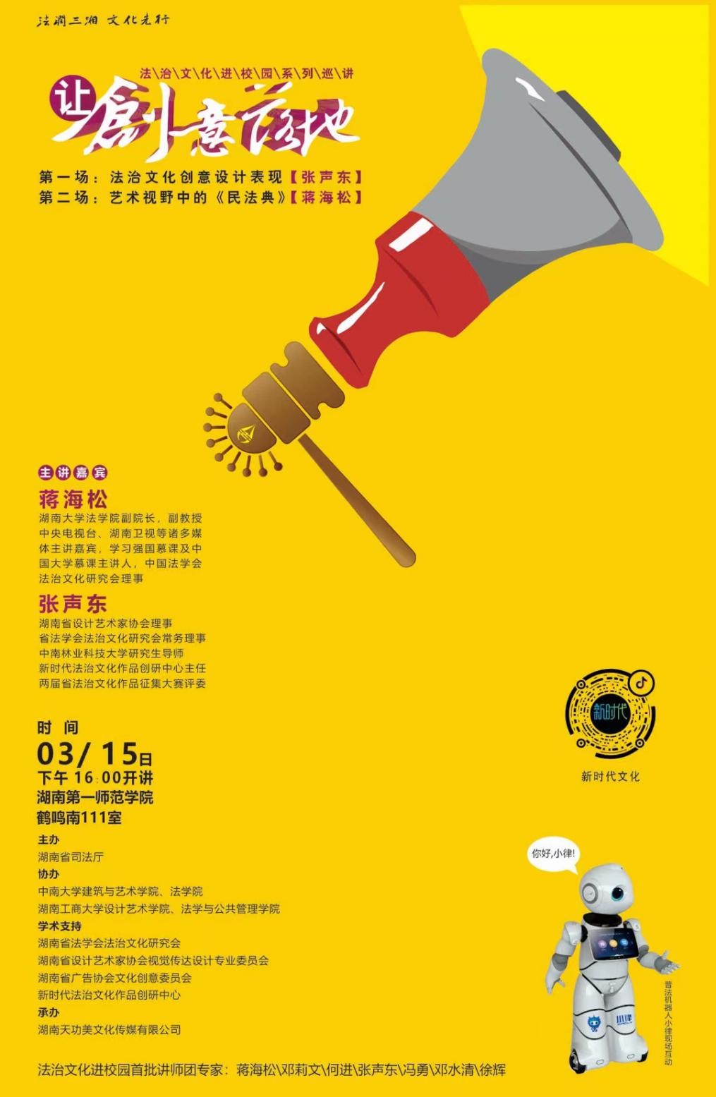2021年3月15日下午,由湖南省司法厅主办、湖南省设计艺术家协会、新时代法治文化作品创研中心等单位承办的“法治文化进校园”高校巡讲活动第一讲在湖南第一师范学院开讲。首场巡讲邀请了 海角社区