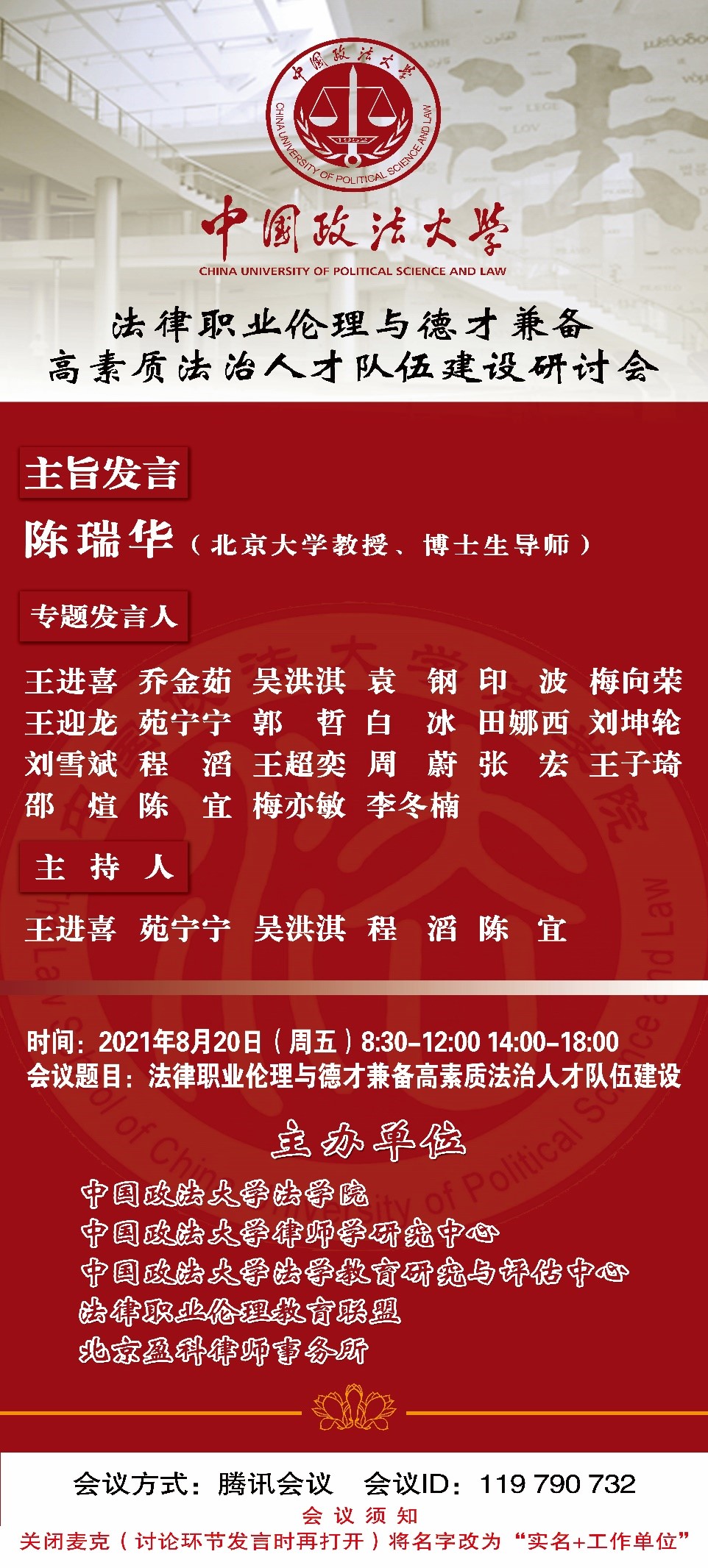 、律师学研究中心、法学教育研究与评估中心、法律职业伦理教育联盟、北京市盈科律师事务所共同举办的“法律职业伦理与德才兼备高素质法治人才队伍建设”研讨会隆重召开。由于疫情,本次研讨会以腾讯会议的方式线上召开。 海角社区