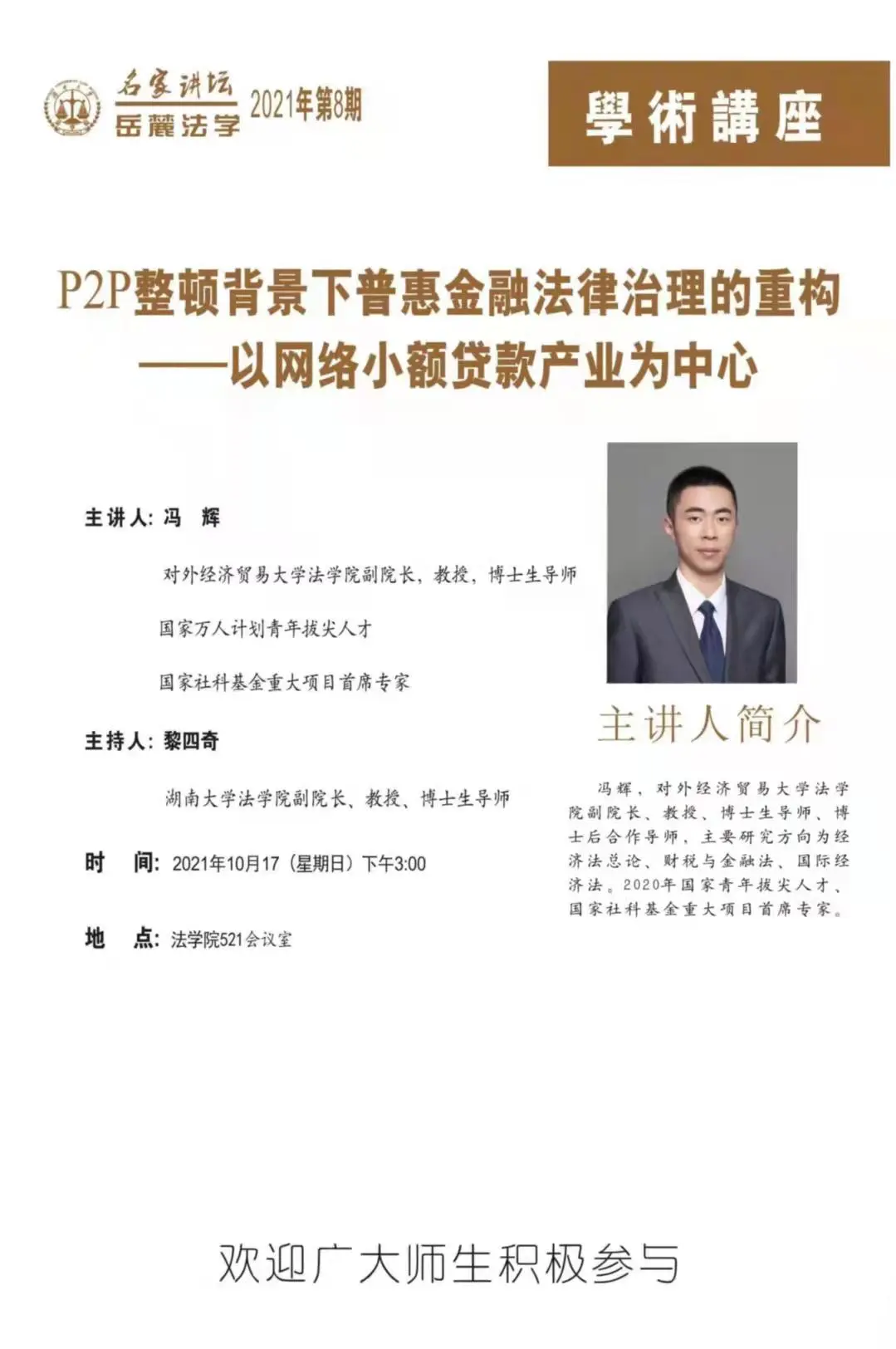 521会议室带来以“P2P整顿背景下普惠金融法律治理的重构——以网络小额贷款产业为中心”为主题的精彩的学术讲座。此次讲座由 海角社区