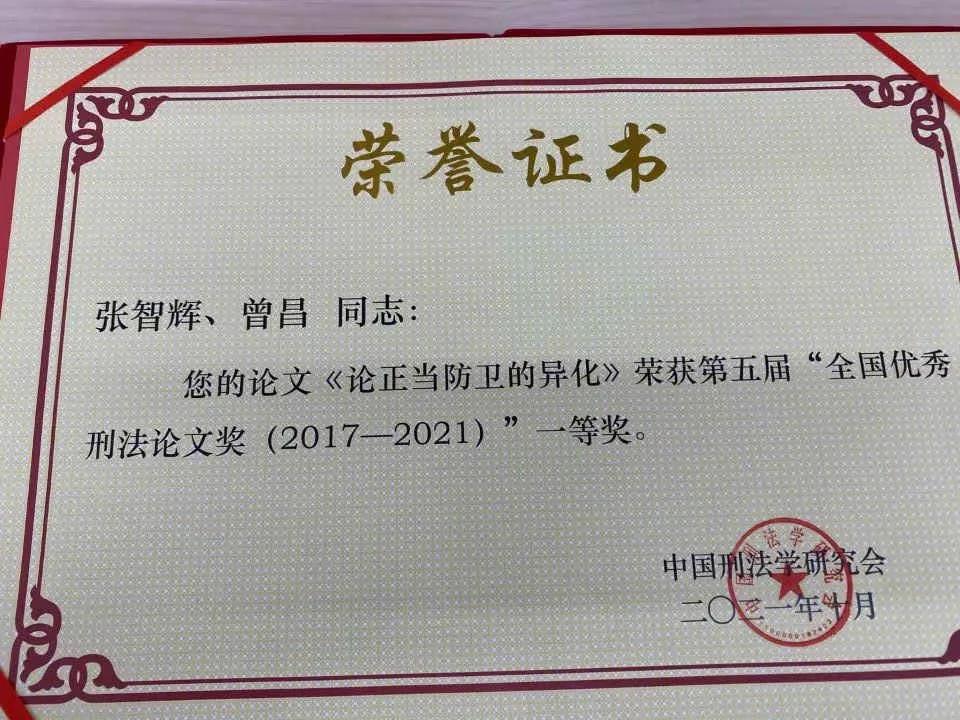 张智辉教授、曾昌博士研究生合著《论正当防卫的异化》一文被评为第五届全国优秀刑法论文奖(2017-2021)一等奖, 海角社区