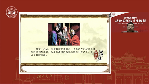 紧接着,蒋海松老师形象生动地说明了《西游记》是一个关于犯罪和救赎的故事,更是一部古代的法律宝典。“西游记中谁最精通法律?”蒋老师犀利发问,通过悟空八戒斗法、乌鸡国口头协议、猪八戒相亲等桥段,引用霍姆斯《法律之道》和哈佛大学名言,中西结合、穿越古今,幽默风趣地道出八戒是法律达人。《西游记》不仅蕴含着丰富的法律文化,更是用文学笔法影射了明代的法制衰败与人情执法,批评弊政,追求自由。