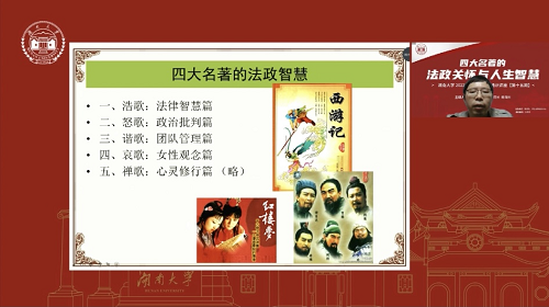 讲座伊始,蒋海松老师与当下防疫现状巧妙结合,戏说四大名著深刻影响了中国人的行为方式与话语方式。并以毛泽东主席痴爱三国西游、盛赞水浒红楼从中感悟革命道理为引,点明通俗小说承载着深刻的政治寓意和法律观念。随后,蒋老师围绕着法律智慧、政治洞察、团队管理、女性观念、心灵修行五个篇章,从法律观念和政治观念入手,谱写出一曲四大名著的法政智慧之歌。