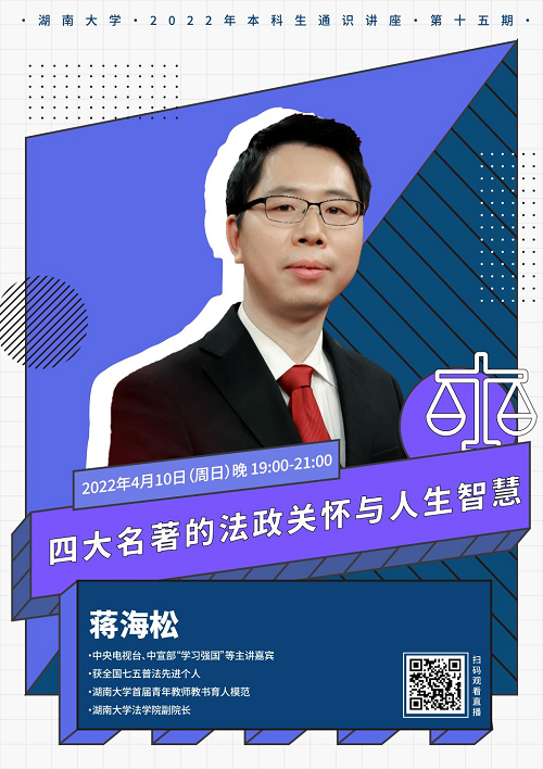 副院长蒋海松副教授以“四大名著的法政关怀和人生智慧”为主题,为大家带来了一场别开生面的法律盛宴。本次讲座由 海角社区