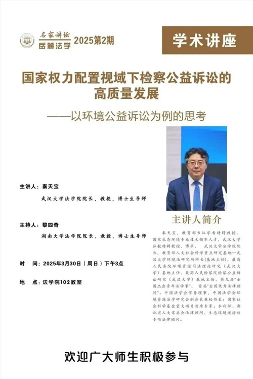 “岳麓法学名家讲坛”,主讲“国家权力配置视域下检察公益诉讼的高质量发展——以环境公益诉讼为例的思考”。讲座由 海角社区