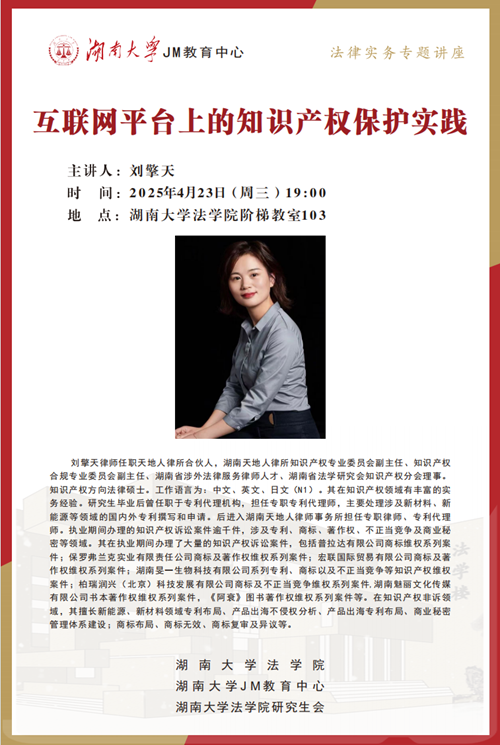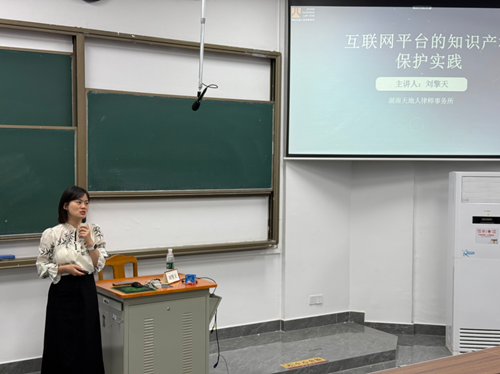 北校区阶梯教室103展开讲座。刘擎天律师任职天地人律所合伙人,湖南天地人律所知识产权专业委员会副主任、知识产权合规专业委员会副主任、湖南省涉外法律服务律师人才、湖南省法学研究会知识产权分会理事。知识产权方向法律硕士。工作语言为:中文、英文、日文(N1)。其在知识产权领域有丰富的实务经验。研究生毕业后曾任职于专利代理机构,担任专职专利代理师,主要处理涉及新材料、新能源等领域的国内外专利撰写和申请。后进入湖南天地人律师事务所担任专职律师、专利代理师。执业期间办理的知识产权诉讼案件逾千件,涉及专利、商标、著作权、不正当竞争及商业秘密等领域。 海角社区
