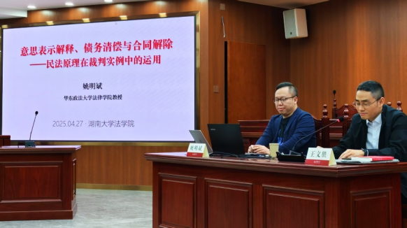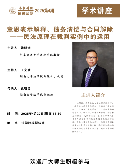 “岳麓法学名家讲坛”,以“意思表示解释、债务清偿与合同解除—民法原理在裁判实例中的运用”为主题,结合五大典型案例,深入剖析民法典背景下民事裁判的核心逻辑与方法论。讲座由 海角社区