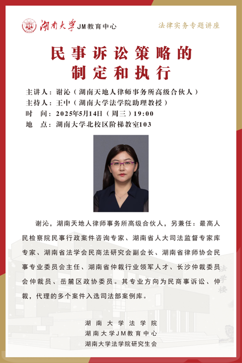 北校区阶梯教室103展开讲座,本次讲座由王中老师主持。谢沁律师现任湖南天地人律师事务所高级合伙人,另兼任最高人民检察院民事行政案件咨询专家、湖南省人大司法监督专家库专家、湖南省法学会民商法研究会副会长、湖南省律师协会民事专业委员会主任、湖南省仲裁行业领军人才、长沙仲裁委员会仲裁员、岳麓区政协委员。其专业方向为民商事诉讼、仲裁,代理的多个案件入选司法部案例库。 海角社区