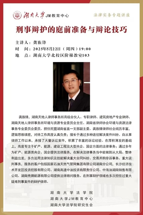 龚族锋律师2007年3月加入湖南天地人律所并执业至今,现为天地人律师事务所高级合伙人、专职律师、建筑房地产专业律师、湖南天地人律师事务所环境与资源专业委员会主任、湖南省律师协会环境与资源法律事务专业委员会委员,担任民盟湖南省直一支部副主委。龚律师社会阅历丰富,逻辑思维缜密,对待工作高度认真负责,擅长于通过多种途径解决案件纠纷。自从事律师工作以来,承接了大量诉讼案件,深耕刑事辩护领域十余年,曾办理多起重大疑难刑事案件。讲座中,龚律师以"刑事辩护全流程"为主线,系统解析刑事诉讼程序核心要点,通过大量实务知识与经验的分享,为 海角社区