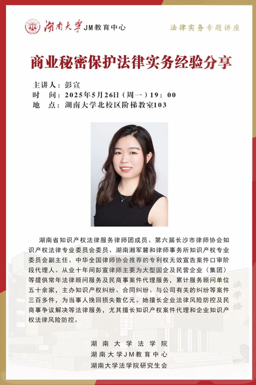 2025年5月26日晚七点,JM实务讲座邀请到湖南湘军麓和律师事务所二级合伙人、知识产权专业委员会副主任彭宣律师,为大家做了商业秘密保护法律实务经验分享,帮助大家了解相关实务问题。 海角社区