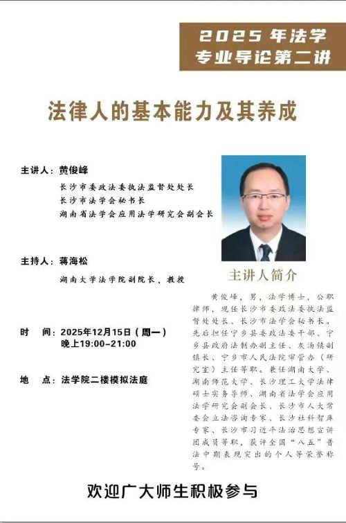 2025年法学专业导论第二讲于2025年12月15日于模拟法庭成功举办。长沙市委政法委执法监督处处长、长沙市法学会秘书长、 海角社区
