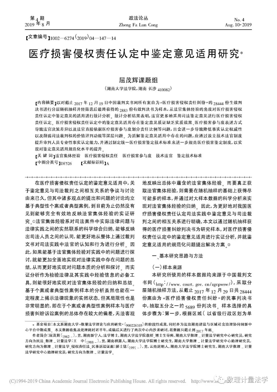 屈茂辉教授领衔的课题组在《政法论丛》(法学CSSCI来源期刊)2019年第4期发表学术论文《医疗损害侵权责任认定中鉴定意见适用研究》。课题组成员有王中、郝士铭等。