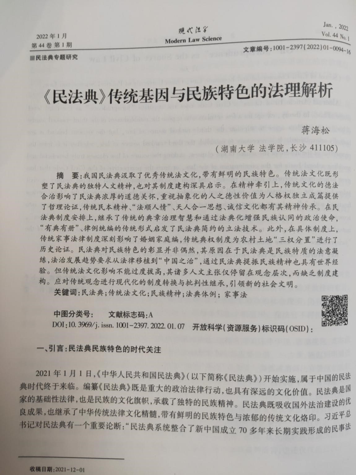 副教授蒋海松在法学类CSSCI核心期刊《现代法学》2022年第1期发表论文《民法典传统基因与民族特色的法理解析》。