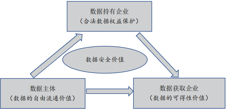 具言之,在企业数据权益争夺的场合,通常涉及三方主体即数据主体、数据持有企业、数据获取企业,三方主体各自都有自己追求的本位价值目标,当然,每一方主体的价值目标可以是多元的,比如就数据主体而言,其不仅注重数据的自由流通价值,而且关注数据安全价值,但从个人数据携带权的视角来说,其最根本的价值还是数据的自由流通价值,即数据的可流通性。对数据持有企业来说,竞争法对数据的控制程度决定了该企业使用数据集参与竞争的限制,所以其本位价值应该是数据持有企业的合法数据权益保护。这其中包含两层含义。