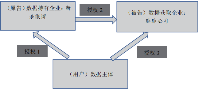 该案中,原告微梦公司经营新浪微博并向用户提供微型博客服务,被告淘友技术公司和淘友科技公司开发的脉脉软件和网站主要向用户提供移动社交服务。为了尽可能地向用户提供社交机会和交友服务,被告采取了关联与分析用户在原告所经营的微博服务中所收集的个人及其通讯录等数据的行为。事实上,原告与被告早先签订了行业领域所公认的开放平台数据获取协议(Open API),但原告在其对被告主张的四项不正当竞争行为指控中,提出被告超越开放平台数据获取协议非法抓取和使用用户信息,并“非法获取并使用脉脉注册用户手机通讯录联系人与新浪微博用户的对应关系”。北京知识产权法院在该案二审过程中认为,数据获取企业在通过开放平台数据获取协议模式获取个人数据时,应当获得“三重授权”。第一重授权是作为数据主体的用户对数据持有企业(数据控制者)的授权,即用户允许数据持有企业向数据获取企业共享数据。第二重授权是作为数据共享让渡方的数据持有企业的授权,即数据持有企业允许数据获取企业获取数据。在此环节,双方主要是通过签订开放平台数据获取协议的形式明确双方数据共享的具体范围及各自权利义务的内容。第三重授权是数据主体对数据获取企业的授权,即数据主体允许数据获取企业处理、控制和使用其获取的来自数据主体的数据(详细授权规则如图1所示)。