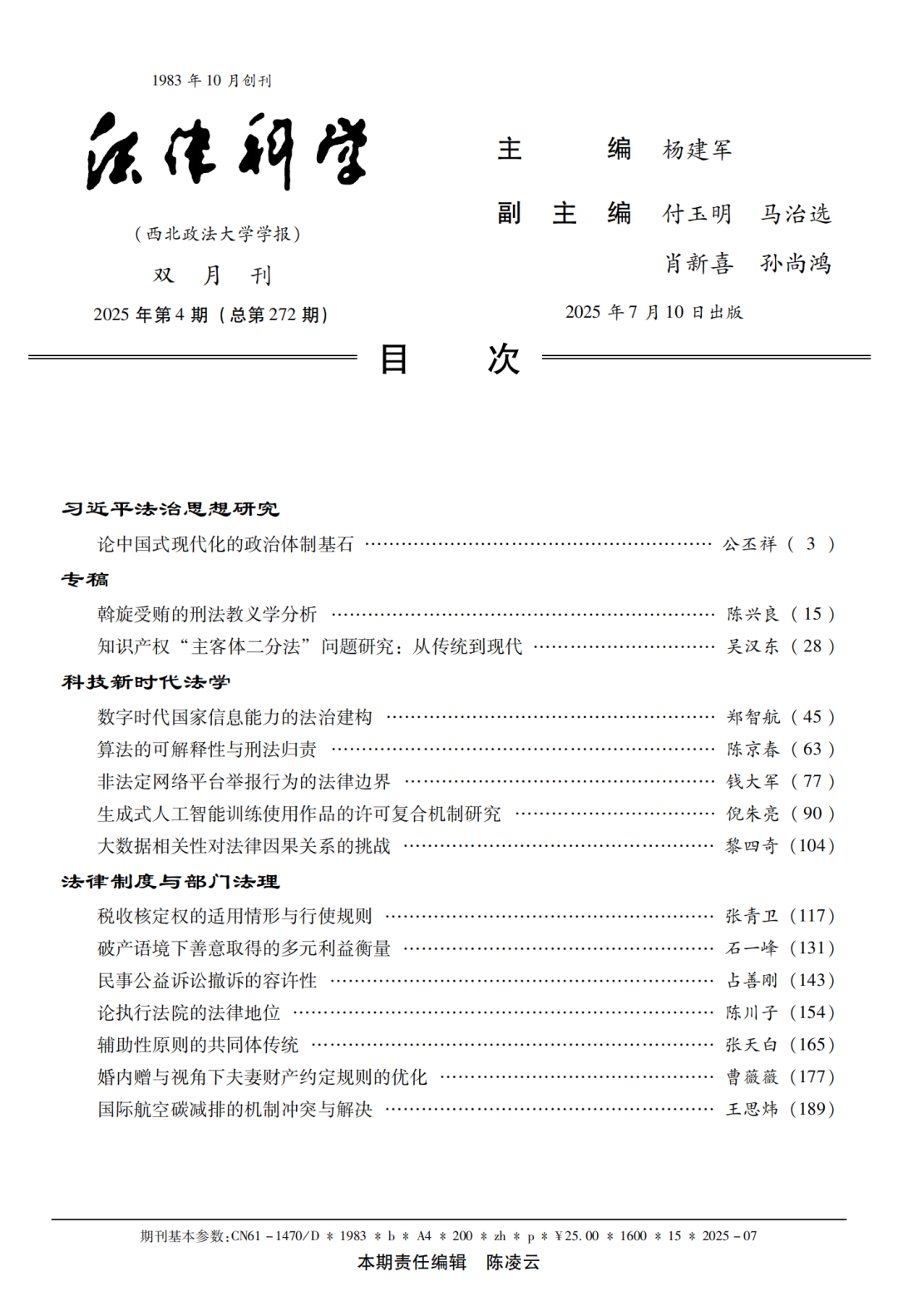 黎四奇教授在《法律科学》2025年第4期发表论文《大数据相关性对法律因果关系的挑战》。