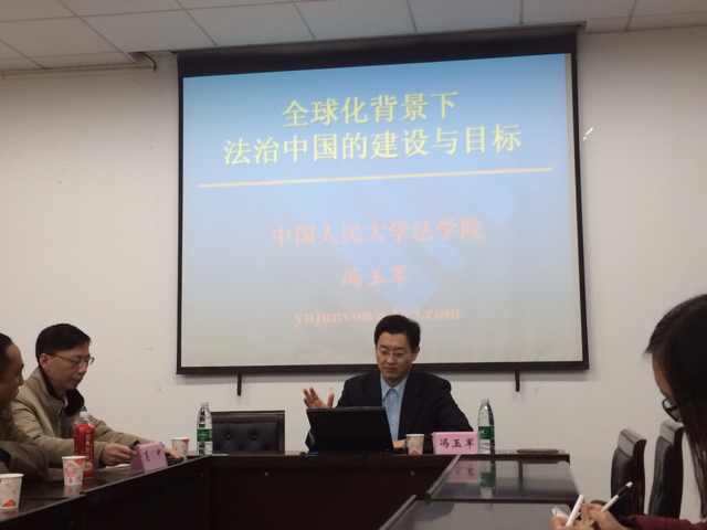 最后,冯教授对实现法治中国的主要途径和目标愿景谈了自己的看法,提出了良好的建议。他认为存在着一种公平正义、民主自由、隆权重法、社会和谐的普世价值,并对法治寄予了民主参与、开放试错、多元统一、协调发展的美好愿景。