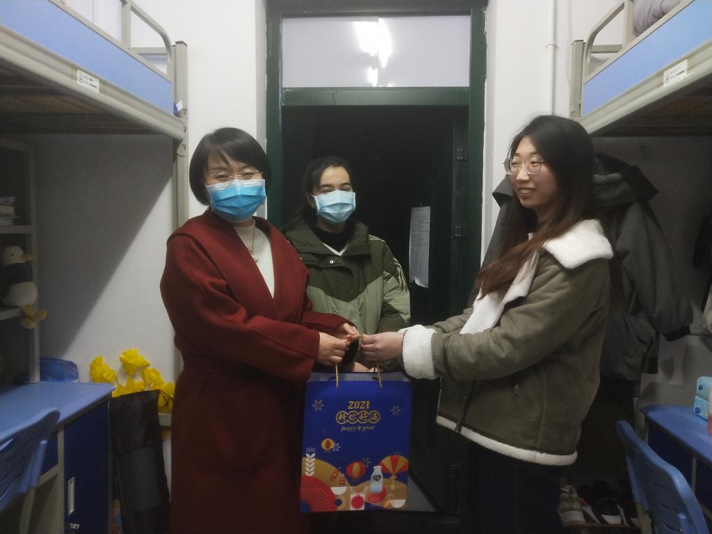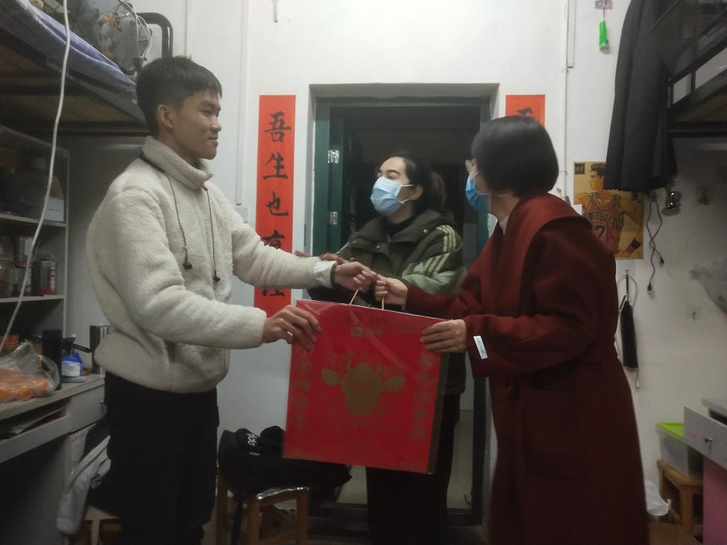 罗英老师走进学生宿舍,与留校学生亲切交流,了解同学们寒假未能返乡的原因,询问他们在校的日常学习和生活情况,并送上牛奶、零食等生活用品,嘱咐他们要注意安全,严格遵守学校相关疫情防控工作的安排,多与家人联系,过一个平安充实的假期。