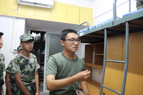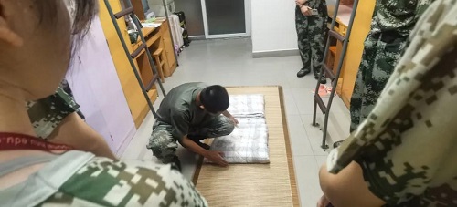 早在前些日子,教官们已经巡查过一次寝室,初步指导了同学们内务整理的方法。随后更是亲身上阵,教同学们叠传说中的“豆腐块”。