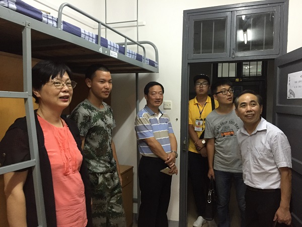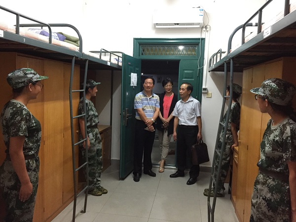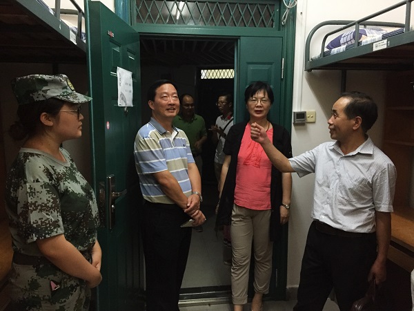 2016级新生宿舍分布在天马园区一区一栋、二区一栋和三区十三栋。屈院长和李书记首先来到二区一栋女生寝室看望新生。“你的家是哪里的?”“湖南的气候能适应吗?” “军训每天几点起床,休息的如何?”“第一次离开家想不想父母?”各位领导和老师到每一个寝室都与同学们亲切交谈,仔细询问同学们的生活和军训情况,并鼓励同学们以饱满的热情、认真的态度投入到军训工作中。“你们来到 海角社区